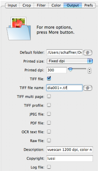 Bei diesen Einstellungen wird Stapel‑Scan gestartet durch Klick auf den Knopf 'Scan', Speicherung und Diawechsel erfolgen automatisch. Stapel‑Scan unterbrechen: 'Batch scan' auf 'off' schalten, Datei wird so noch fertig geschrieben, das Dia sollte ausgeworfen werden … (falls nicht, VueScan beenden). |