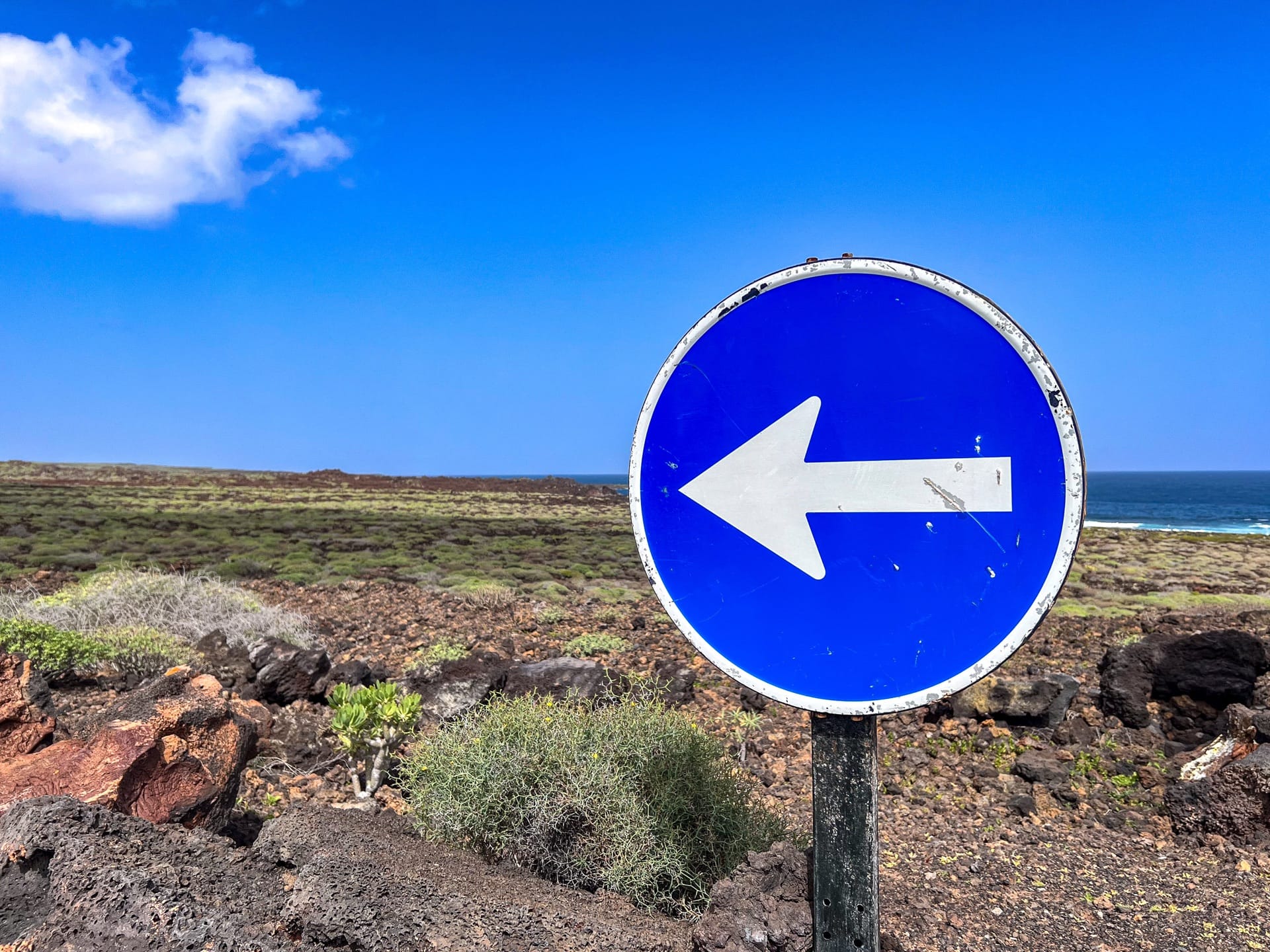 Im Fokus steht ein kreisförmiges, blaues Verkehrsschild mit einem weissen Pfeil, der nach links deutet.