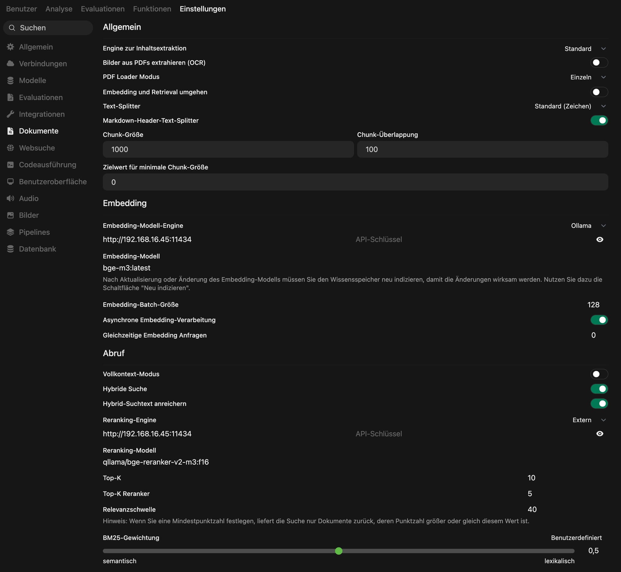 - Abruf (Retrieval): Einstellungen fĂŒr die Suchstrategien (hybride Suche, Vollkontext), Reranking-Modelle sowie Schwellenwerte fĂŒr die Relevanz und BM25-Gewichtung.