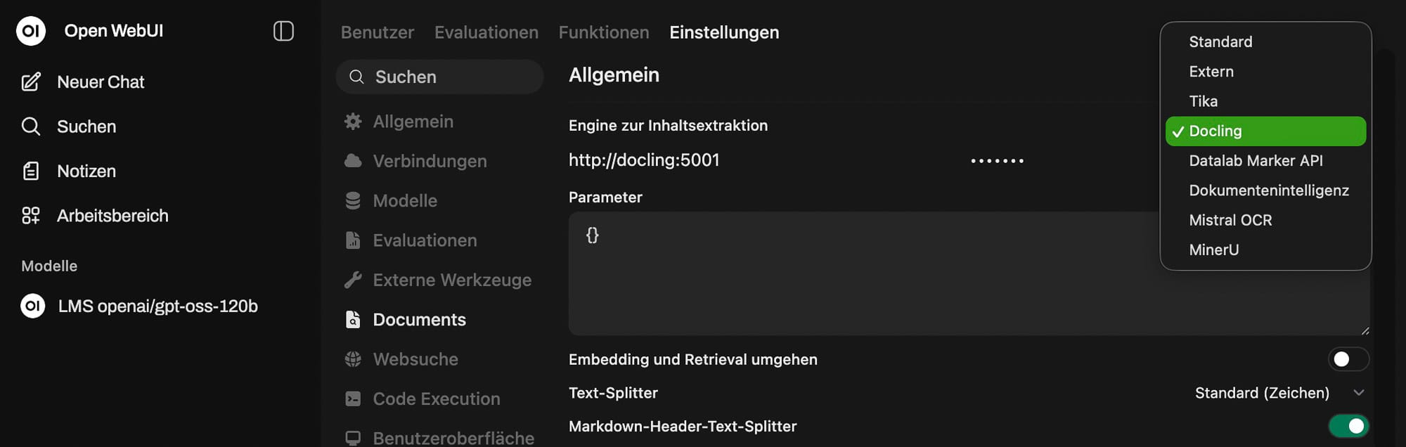 - Engine zur Inhaltsextraktion: Docling wählen