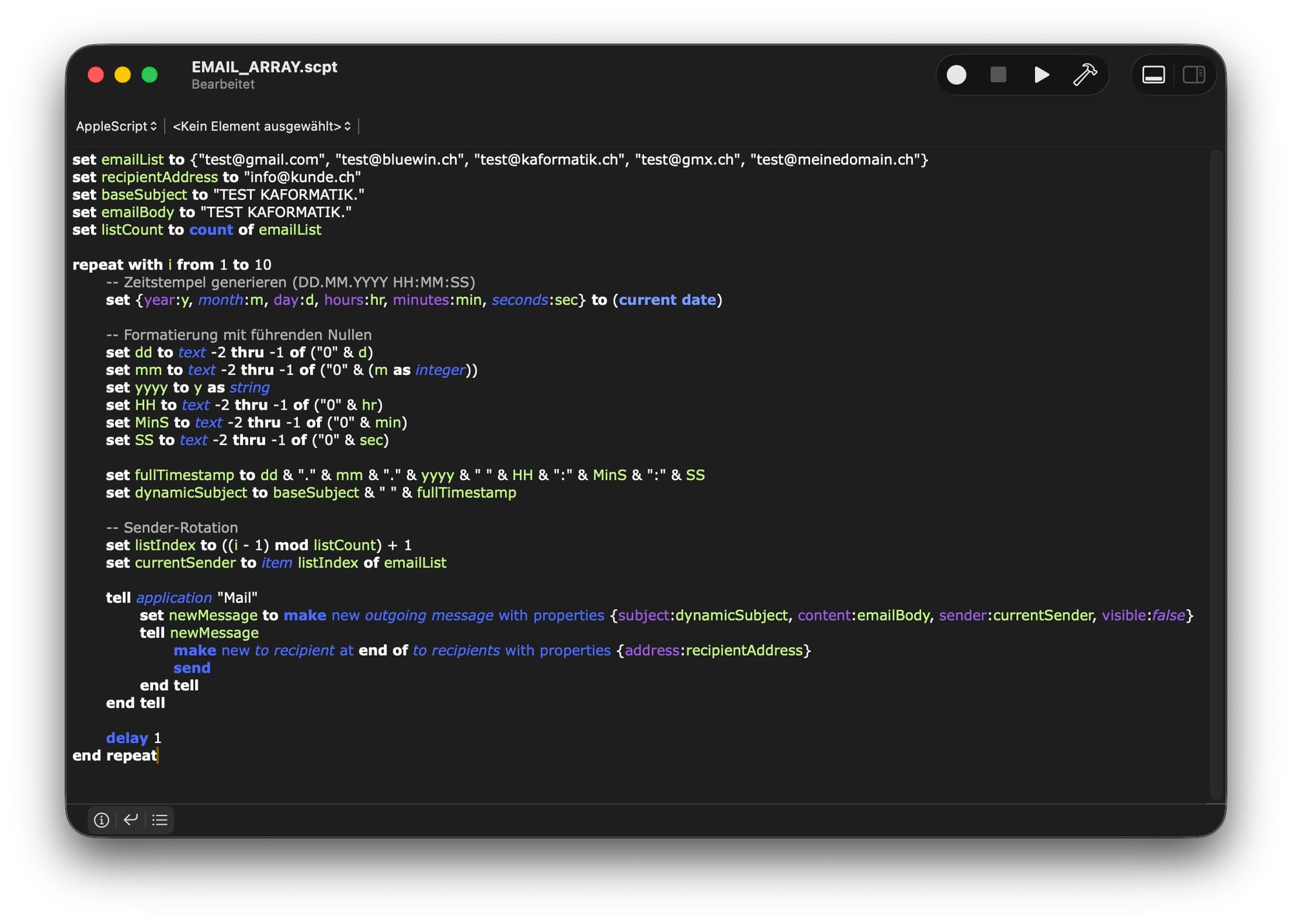 set emailBody to "TEST KAFORMATIK."