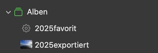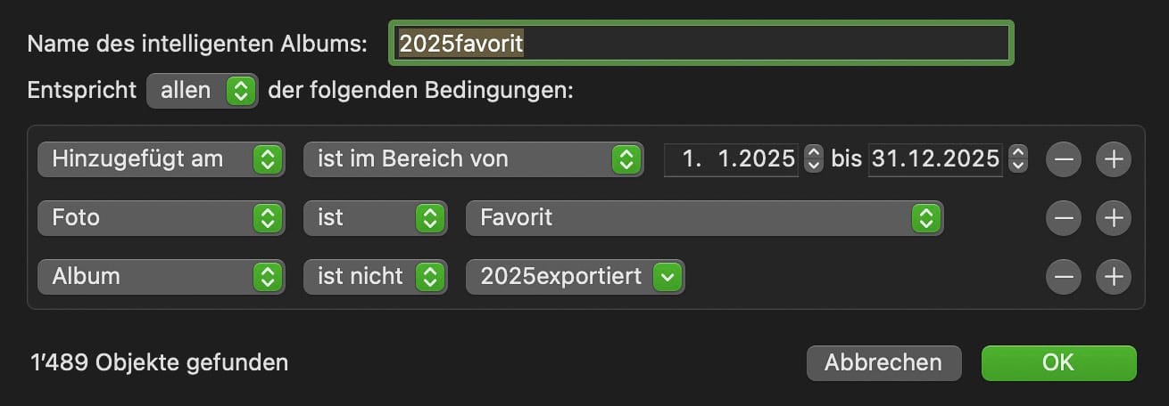 - Noch nicht exportierte Fotos können mit einem intelligenten Album einfach angezeigt werden. Datumsbereich definieren, alle Favoriten sollen angezeigt werde, ausser den schon exportierten im Album '2025exportiert'