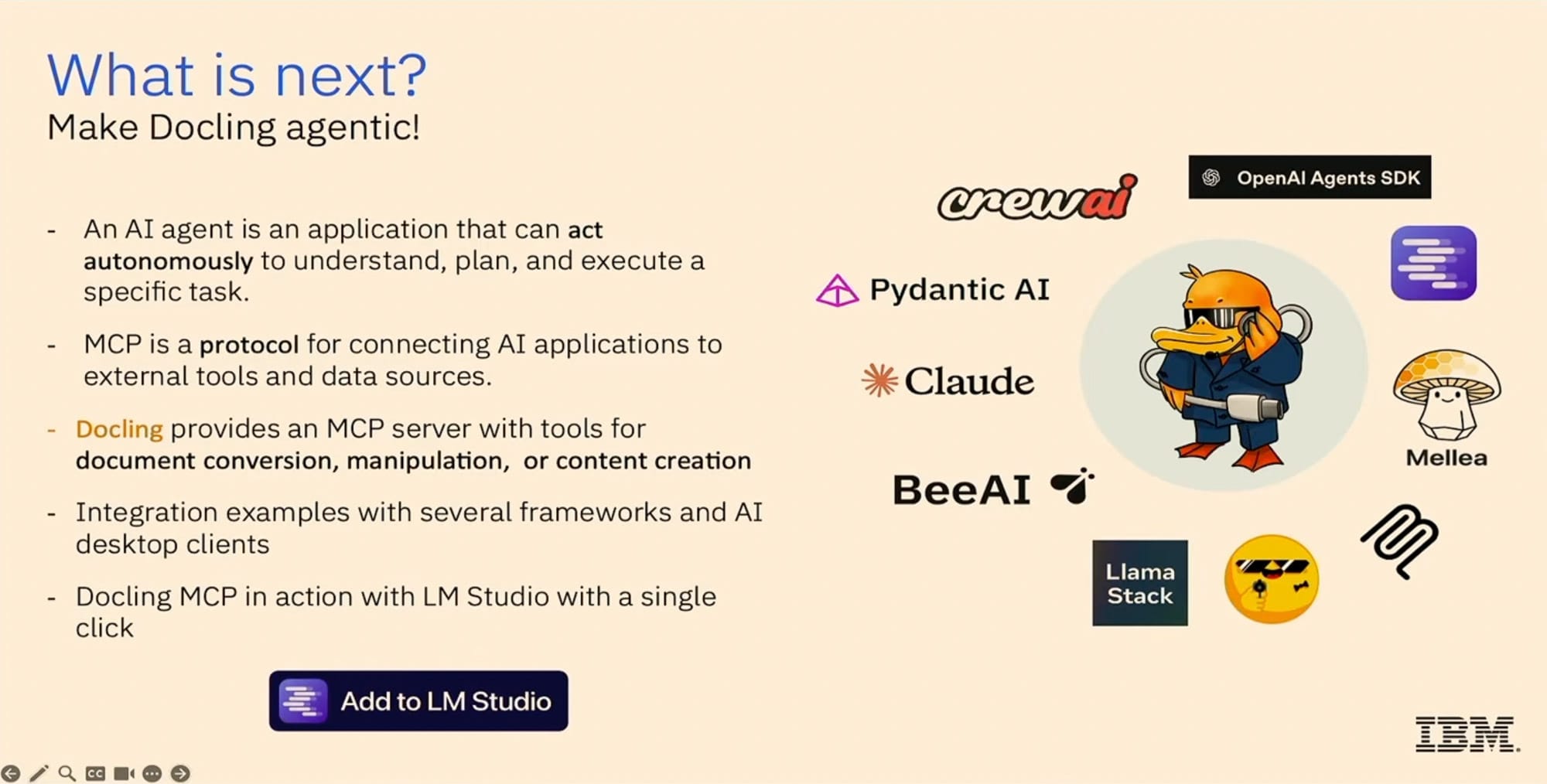 Agenten nutzen LLMs zur Zielerreichung und können über Tools auf externe Funktionen zugreifen. Wir haben Docling MCP entwickelt – eine Toolbox, die Docling‑Funktionen als MCP‑Tools bereitstellt und in Umgebungen wie LM Studio oder Cloud‑Desktop läuft. Beispiele: